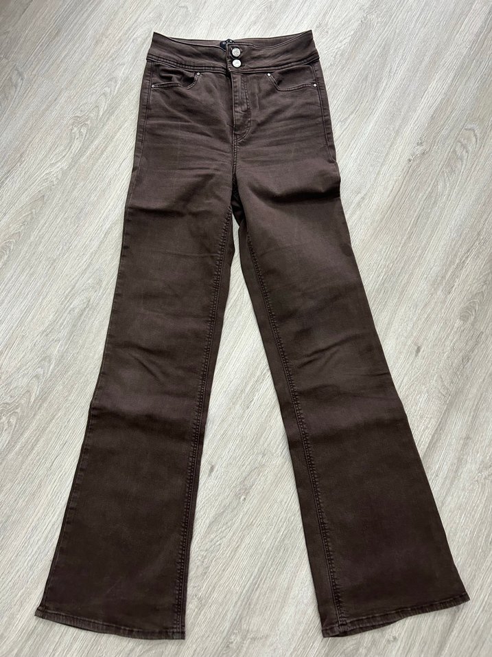 Kadınlar için düğmeli ön kısmı, normal kesimi kahverengi pamuk kot pantolon. Günlük kullanıma uygun, desensiz tasarım. Oxxo marka ispanyol paça 1 gün kullanıldı sorunsuz deformesizdir