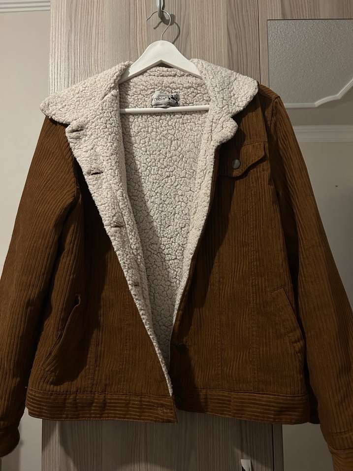 Düğmeli kahverengi süet ceket, yumuşak iç astar ve kesik yakaya sahip. Bol kesim ve uzun kollu, rahat sokak stili için uygundur. Cep kısmında çok az dikişi sökülmüştür fotoğrafta belirtildi.