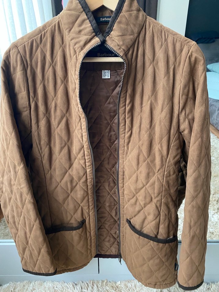 Kahverengi süet kumaştan, düğmeli ve normal boyda, parlak görünümlü kadın ceket. Uzun kollu ve regular fit, günlük rahat stil için uygundur.