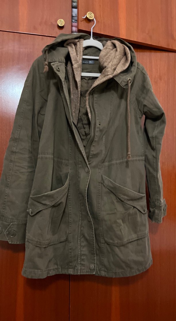 Nefti yeşil kumaştan, düğmeli, cepli ve çift kapüşonlu, uzun kollu, rahat kesim bir kadın parka/ceketi. Az kullanılmış