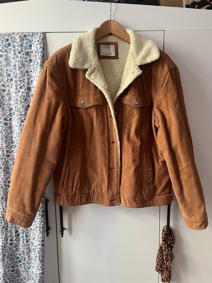 Düğmeli ön cep ve uzun kollu, süet malzemeden yapılmış kahverengi ceket. Rahat kesim ve midi boyuyla günlük sokak stiline uygun, içi sıcak astarlı.