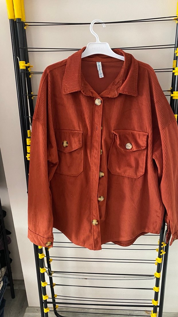 Kahverengi süet kumaştan, düğmeli, uzun kollu, notched lapel yakalı, bol kesim ve midi uzunlukta kadın gömlek. İki düğmeli cep ve parlak yüzey sunar. Casual tarzda günlük kullanım için uygundur. Boy 50cm hiç giyilmedi