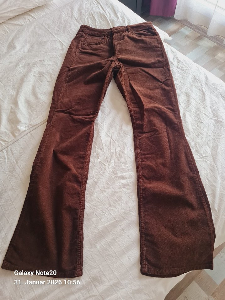 Düğmeli, kahverengi süet kumaştan kadın pantolonu. Normal boy, düz renk ve rahat kesim. Günlük sokak stili için uygun.