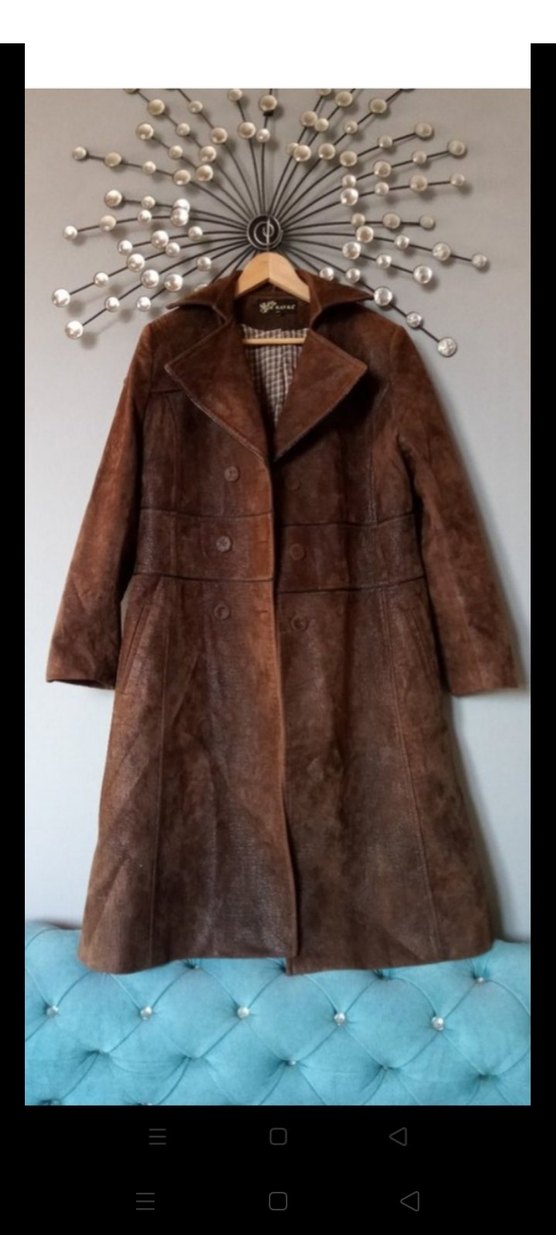 Kahverengi süet kesimdir ve vintage bohem tarzını yansıtır. koltukaltı 54 boyu 105