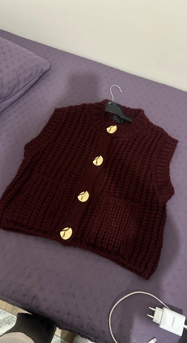 Kahverengi, düğmeli, kolsuz triko süveter. Yuvarlak yakalı, bol kesim ve desen içermeyen rahat bir tasarıma sahiptir. Günlük kullanım için uygundur. Bir kere giyildi