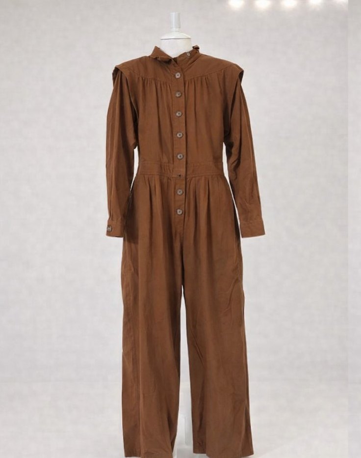 Düğmeli, uzun kollu ve keten kumaştan yapılmış kahverengi uzun tulum. Bol kesim ve vintage sokak stili ile günlük kullanıma uygundur.