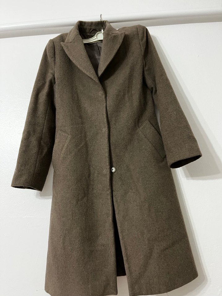 Kahverengi düğmeli kadın uzun palto, yün kumaştan ve regular fit. Notlu yakalı ve uzun kollu, ofis kullanımı için uygun minimal tasarım.