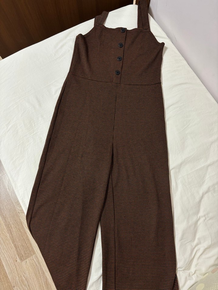 Kahverengi uzun tulum, düğmeli ve askılı kollu tasarıma sahiptir. Notlu yaka ve rahat kesimiyle günlük kullanıma uygundur. ✨
