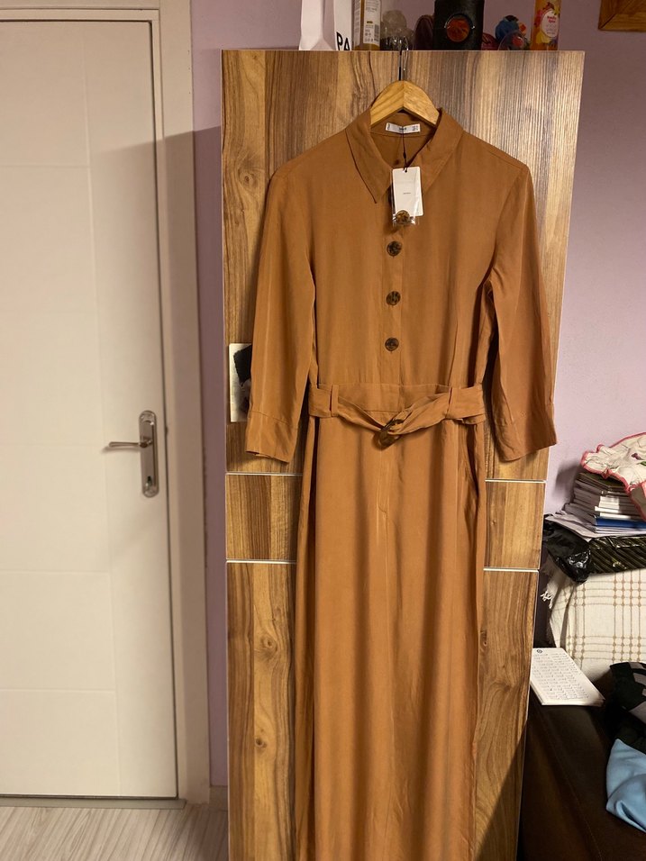 Kahverengi renkli uzun elbise, düğmeli ve belden bağlamalıdır. Uzun kollu, kesimi rahat ve yakası kesik yakalıdır. Parlak ve ipeksi dokusuyla minimalist tarz sunar.