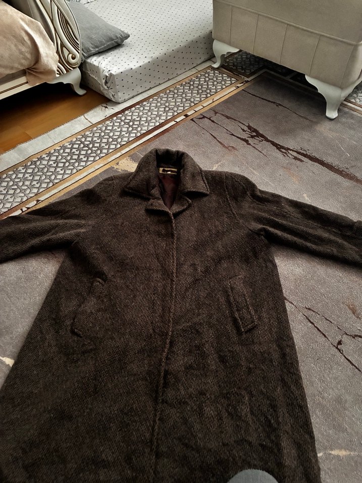 Düğmeli ve yün kumaştan yapılmış, uzun ve bol kesimli kahverengi kadın kaban. Notlu yaka ve uzun kollu, günlük sokak stili için uygun. 48 beden 42 de olur