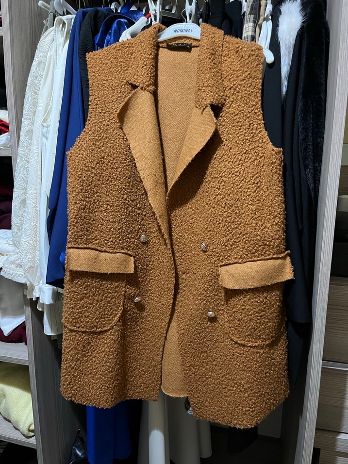 Düğmeli önü ve kesik yakası olan kahverengi, yumuşak ve sıcak dokulu kolsuz yelek. Normal boy ve rahat kesimlidir, günlük sokak stiline uygundur.
