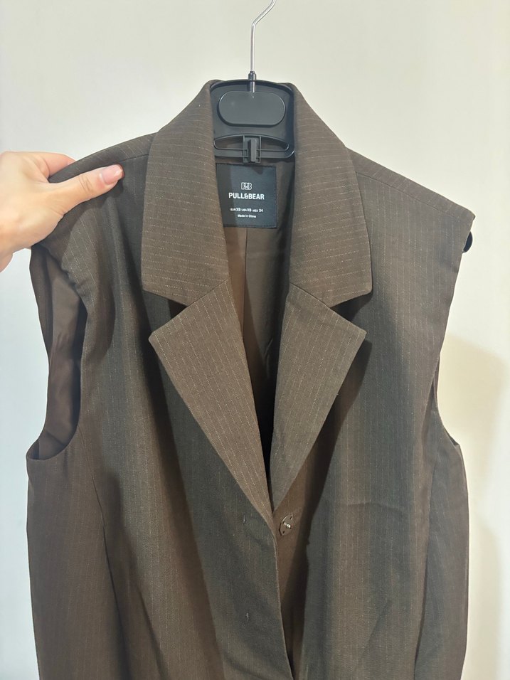 kumaştan, düğmeli ve kolsuz kahverengi kadın yelek. Normal kesim ve midi boyda, ofis ve sokak stiline uygun.