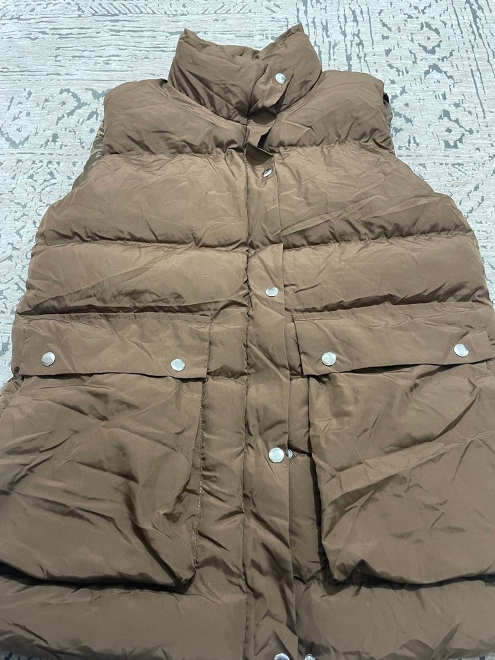 Kahverengi, düğmeli, yakalı ve kolsuz kadın yeleği. Rahat kesimi ve yumuşak sentetik kumaşıyla günlük kullanıma uygun, sokak tarzında sıcak tutar. Etiketli sıfır ürün