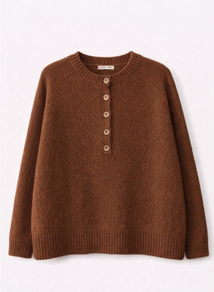 Düğmeli ve yuvarlak yaka bu kahverengi yün kadın kazak, uzun kollu ve bol kesimdir. Rahat ve sade tasarımıyla günlük kullanıma uygundur.