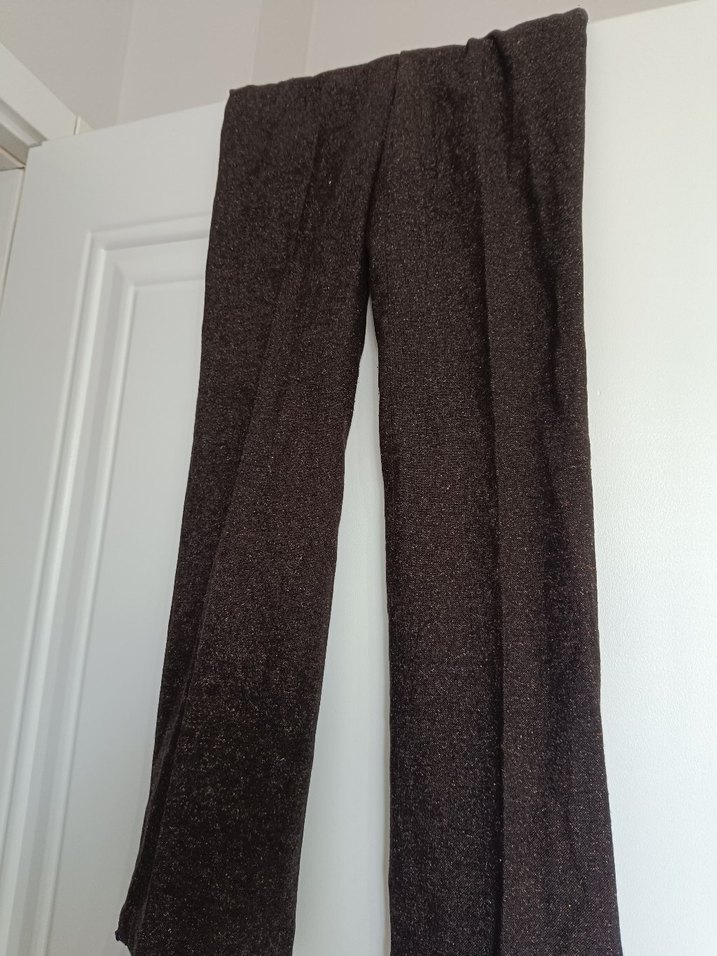 Düğmeli kahverengi yün kumaş pantolon, normal kesim ve midi boy, ofis için uygundur. Normcore tarzda rahat bir seçenektir.