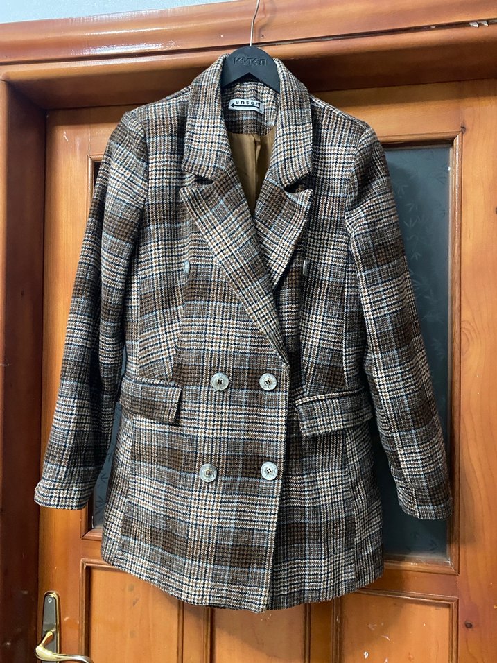 Kahverengi kareli kadın blazer, düğmeli, normal kesim ve uzun kolludur. Yün kumaştan yapılmış, midi uzunlukta, günlük ve iş tarzına uygundur.