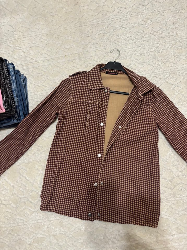Kahverengi kareli, düğmeli, uzun kollu, kadın ceket. oversizedır. 1 kere anca giyilmiştir onu da hatırlamıyorum hiçbir sorunu yok