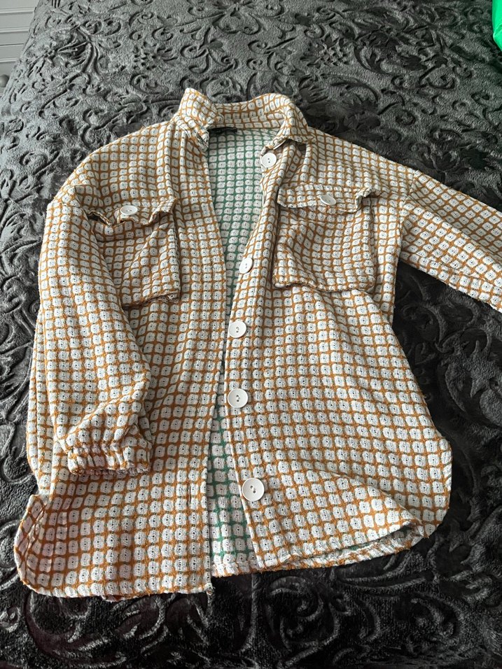 Düğmeli, uzun kollu, bol kesim kadın gömleği. Pastel kahverengi kareli desende, yumuşak sentetik kumaştan, günlük kullanıma uygun.