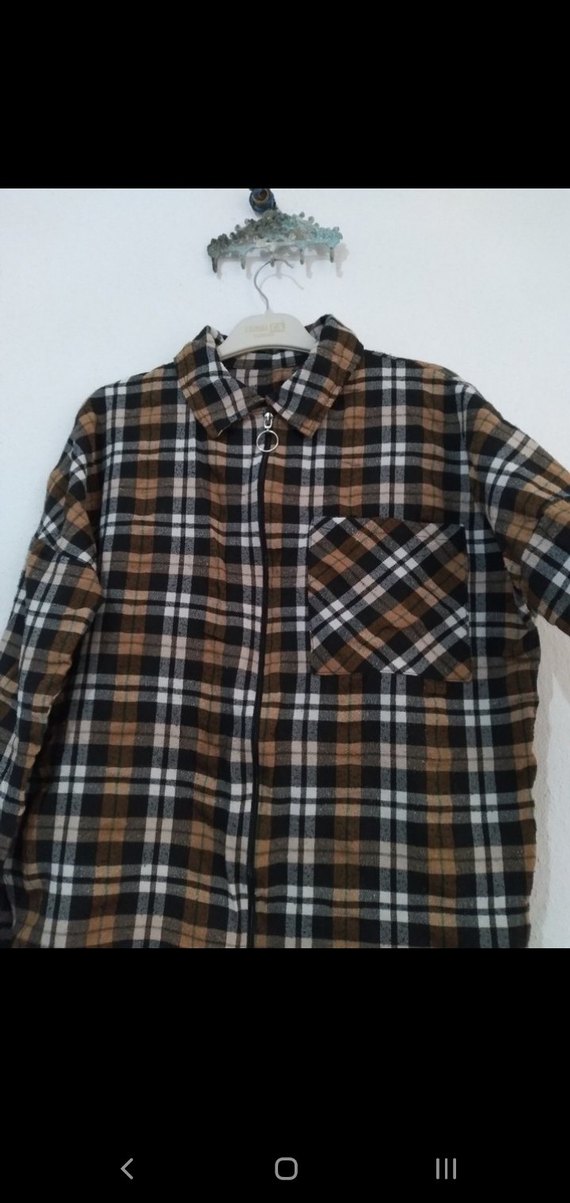 Kahverengi kareli gömlek, uzun kollu, düğmeli ve yakalıdır. Rahat kesim ve tek göğüs cebine sahiptir, günlük sokak stili için uygundur. temiz giyildi boyu 70cm iki koltuk arası 60cm