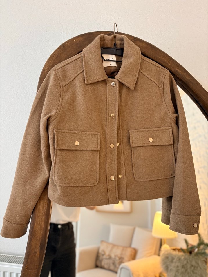 Düğmeli ön kısmı, kesik yaka ve uzun kollu kahverengi kaşe ceket. İki cep detaylı, rahat kesim ve günlük sokak stili için uygundur.