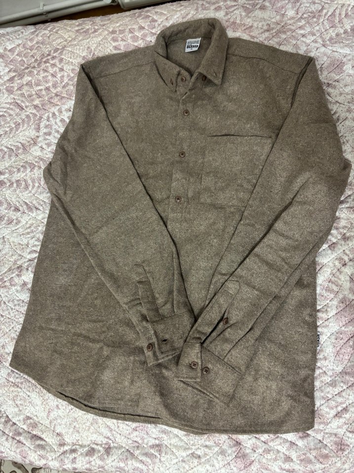 Uzun kollu, düğmeli ve yakalı kahverengi keten erkek gömlek. Rahat kesimi ve yumuşak kumaşıyla günlük sokak stiline uygundur.
