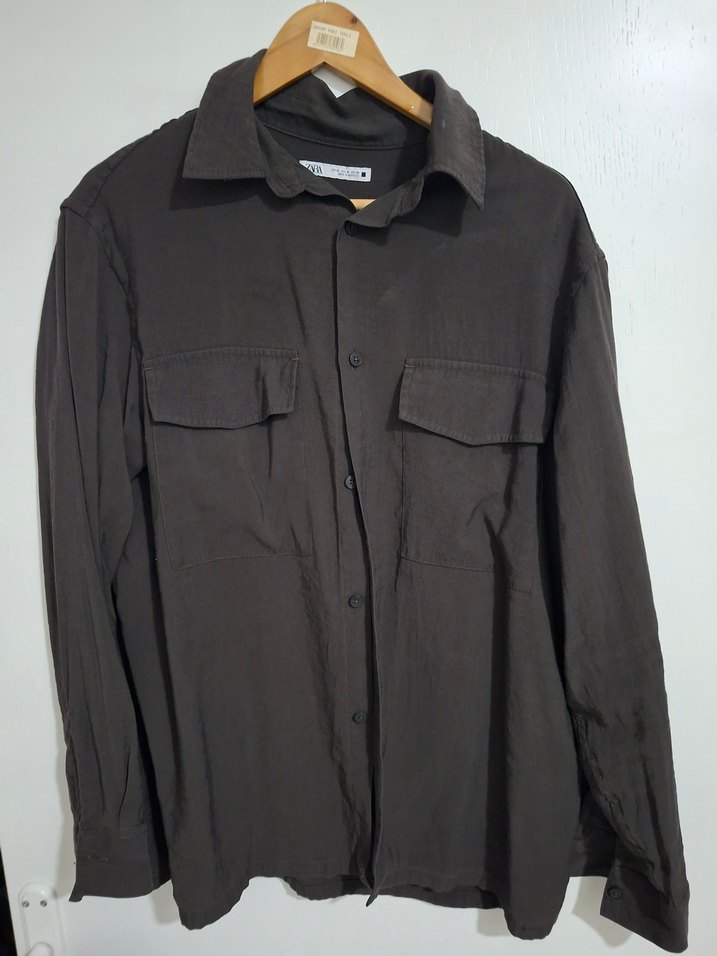 Kahverengi keten kumaştan kadın gömleği, uzun kollu, düğmeli ve notlu yaka detaylıdır. Rahat kesimi ve cep detaylarıyla günlük kullanıma uygundur.