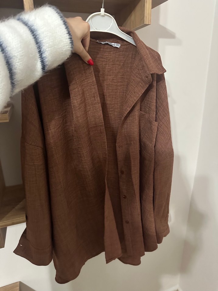 Düğmeli kahverengi keten gömlek, notlu yaka ve uzun kolludur. Salaş kesimi ve midi boyu ile rahat ve şık bir sokak stili sunar. Desensiz, günlük kullanıma uygundur.