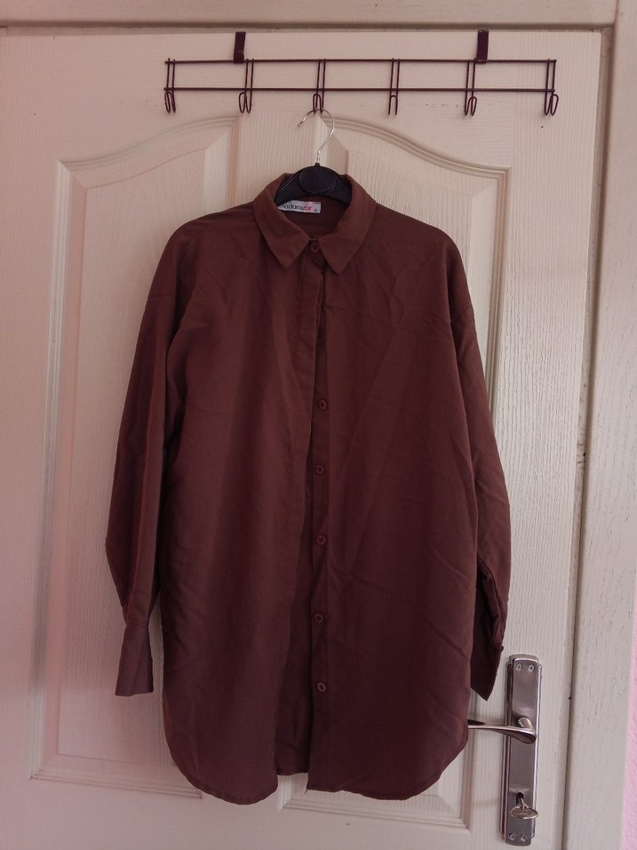 Kahverengi keten gömlek, düğmeli ön ve yakalı tasarımıyla bol kesimdir. Uzun kollu ve günlük kullanıma uygundur.