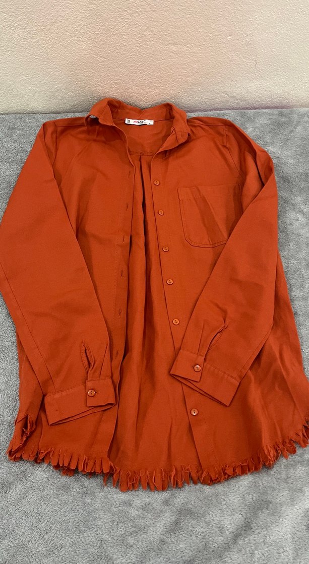 Kahverengi keten kadın gömlek, uzun kollu ve düğmeli. Notlu yaka ve bol kesimiyle midi boyda, püsküllü etek ucu bulunur. Rahat sokak stili için uygun.