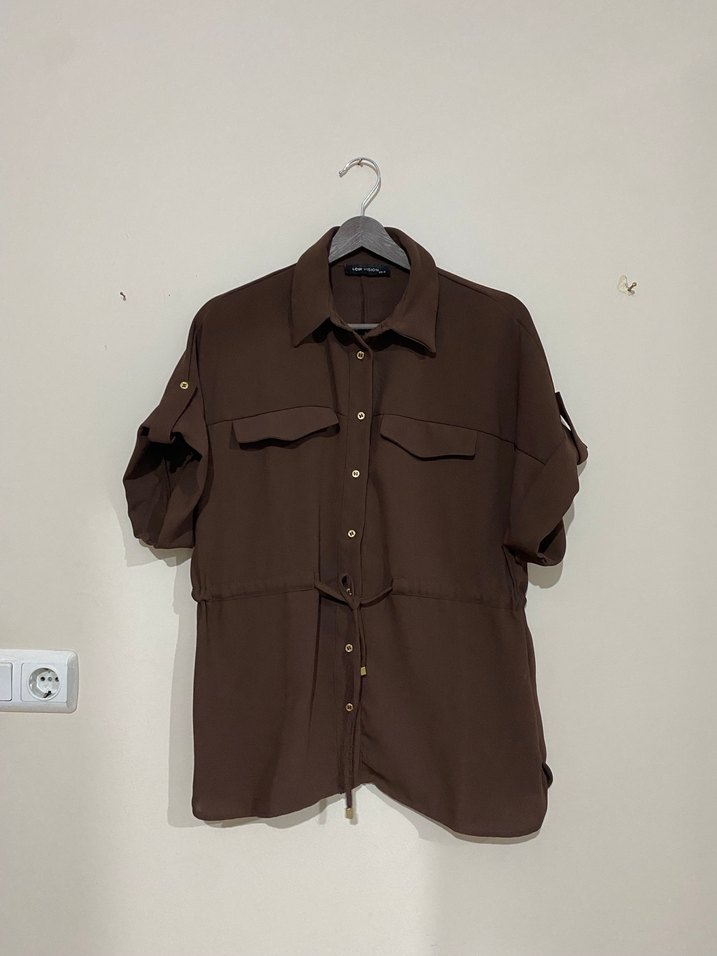 Düğmeli ön kısmı ve belde bağcığı bulunan, kısa kollu, yakalı, kahverengi keten gömlek. Salaş kesim ve midi boyuyla rahat sokak tarzına uygundur.