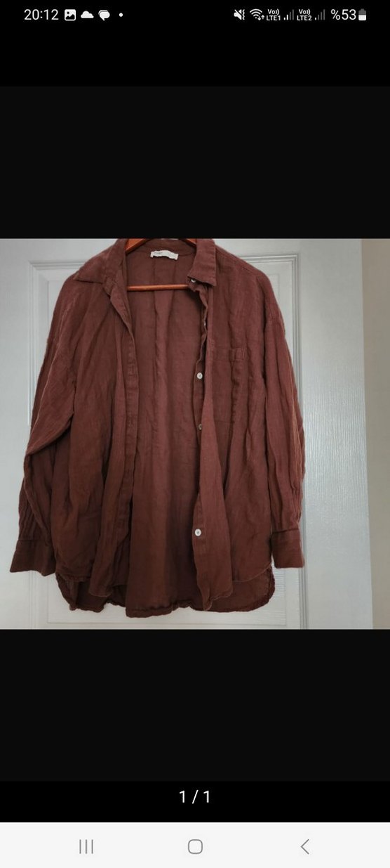 Düğmeli, keten kumaştan, kahverengi, uzun kollu, notched lapel yakalı bol kesim midi uzunlukta kadın gömleği. Minimalist bohem tarzda, günlük kullanıma uygun. 2-3 krre kullanıldı sorunsuz