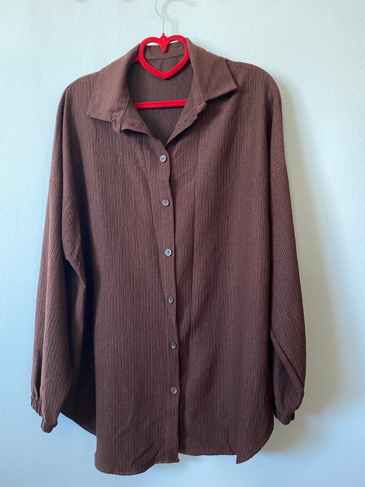 Düğmeli, yakalı ve uzun kollu kahverengi keten kadın gömleği, bol kesimli ve günlük kullanıma uygun bohem tarzda.