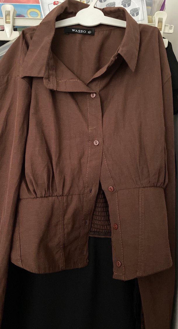 Düğmeli kahverengi keten gömlek, uzun kollu ve kesimli yakaya sahip. Ofis için uygun, normal midi boyda rahat bir görünüm sunar.
