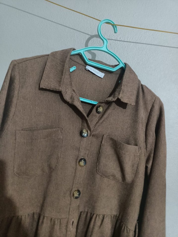 Kahverengi keten kadın gömlek elbise, düğmeli ön, uzun kollu ve yakalıdır. Salaş kesim, midi boyda olup günlük rahat sokak stili için uygundur. Desensizdir.