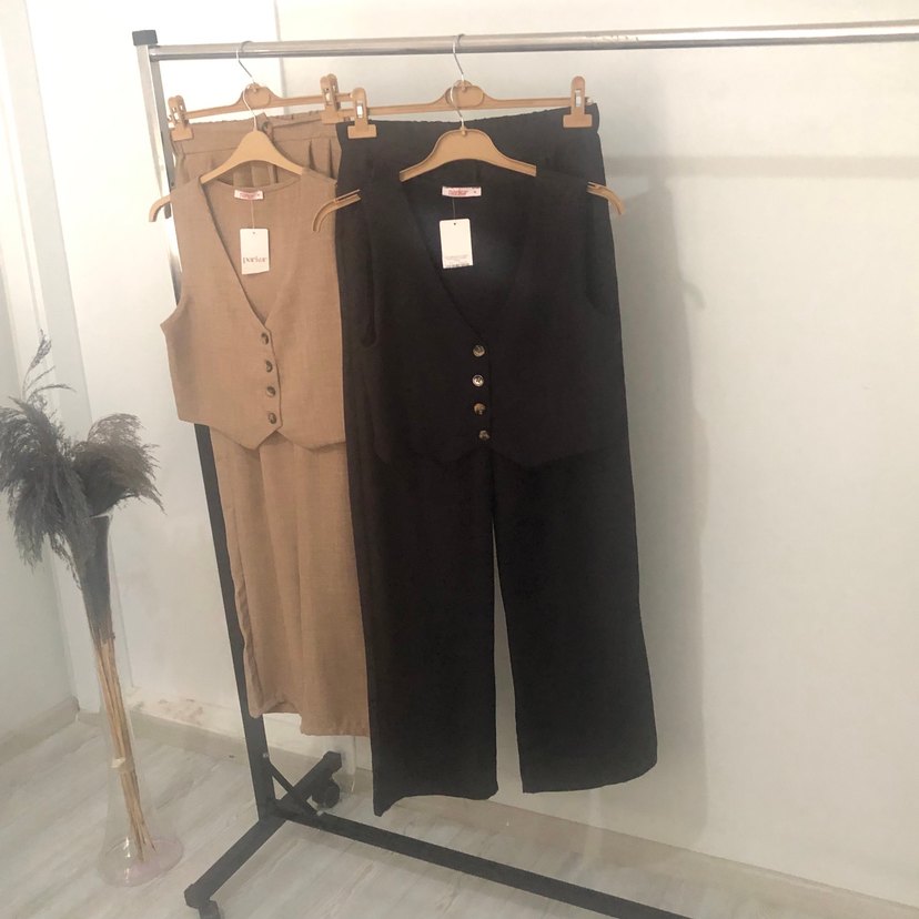 Kahverengi keten kumaştan, düğmeli, regular fit ve uzun kesim kadın kumaş pantolon. Ofis için uygun, yakası çıkmalı ve kolsuz tasarım.