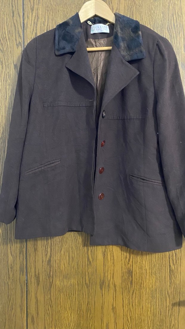 Düğmeli, kahverengi keten kumaştan yapılmış, normal boy midi uzunluğunda, uzun kollu ve kesimli yakalı kadın kaban. Ofis için uygun.