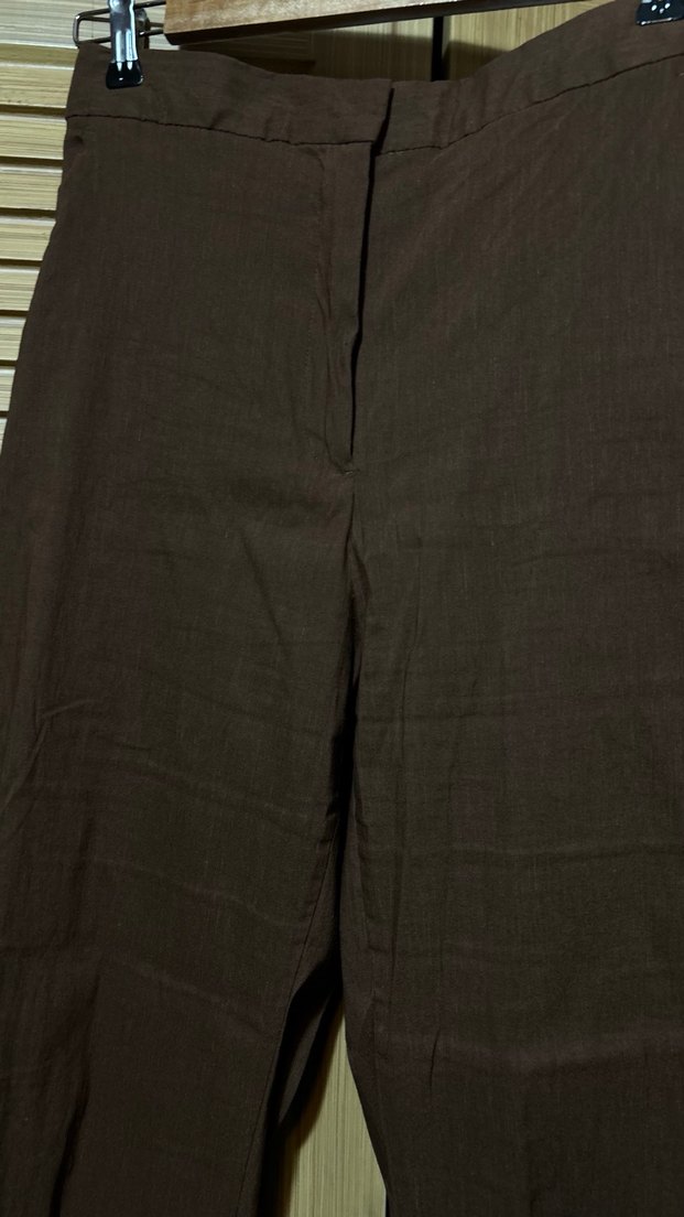 Keten kumaştan, düğmeli, kahverengi kadın pantolon. Normal boy midi kesim, sade ve minimalist tasarım, ofis için uygun.