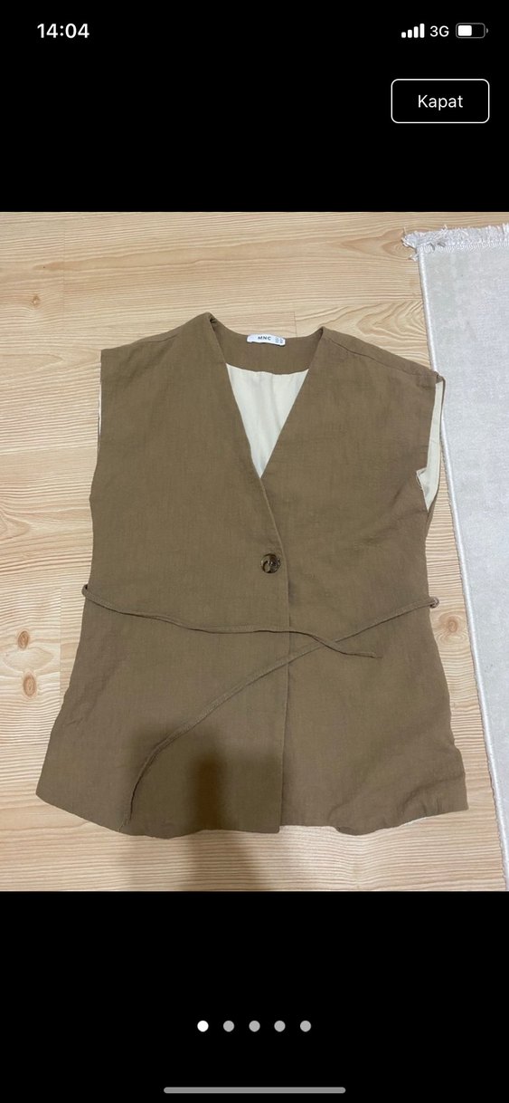 Kahverengi keten, düğmeli, kolsuz kadın yelek. Normal uzunlukta, regular fit ve kesik yakalı, minimal ve normcore tarzına uygun.