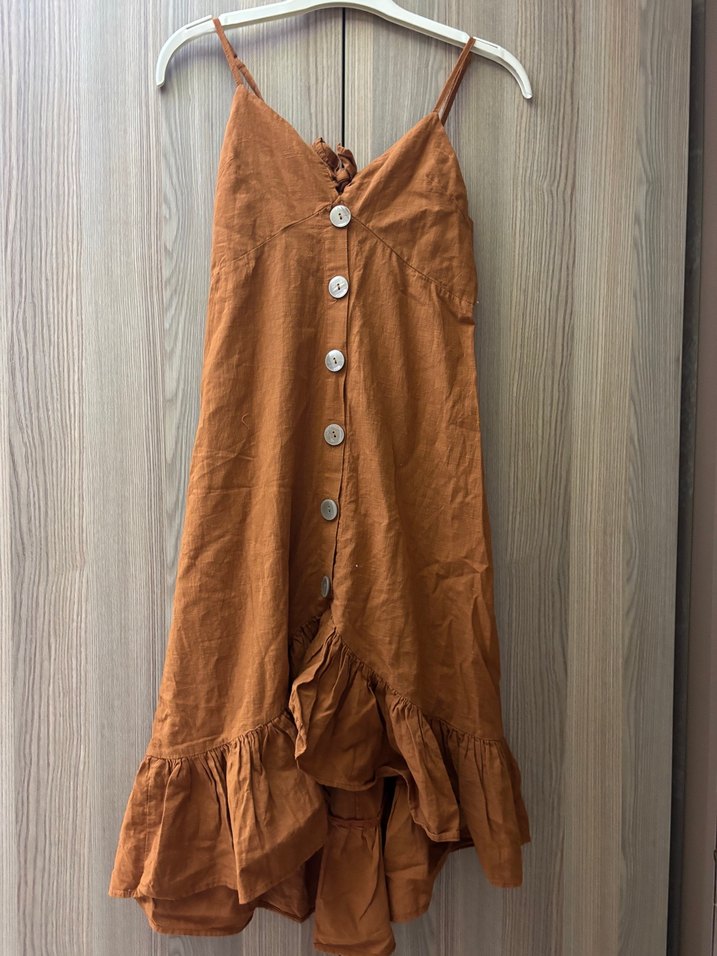 Düğmeli ön kısmı ve bol kesimiyle kahverengi keten uzun elbise. Askısız ve kolsuz, parlak dokusu ve volanlı etek ucu bohem tarzı yansıtıyor.