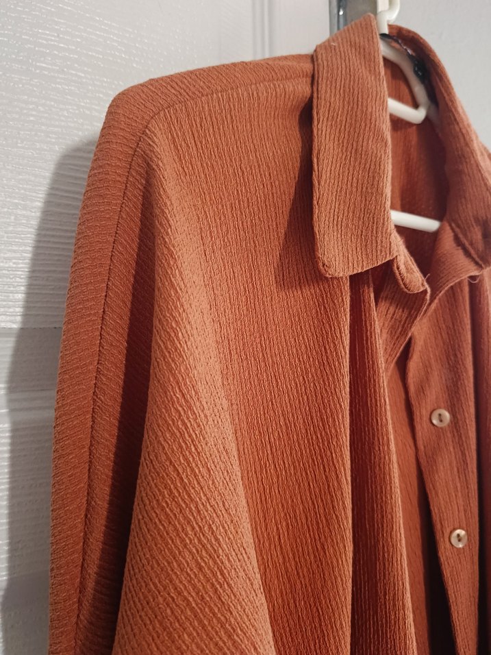 Kahverengi keten gömlek, düğmeli ve kesik yakalıdır. Gevşek kesim ve uzun kollu olup parlak dokusuyla minimal ve normcore tarzını yansıtır. Günlük kullanıma uygundur.