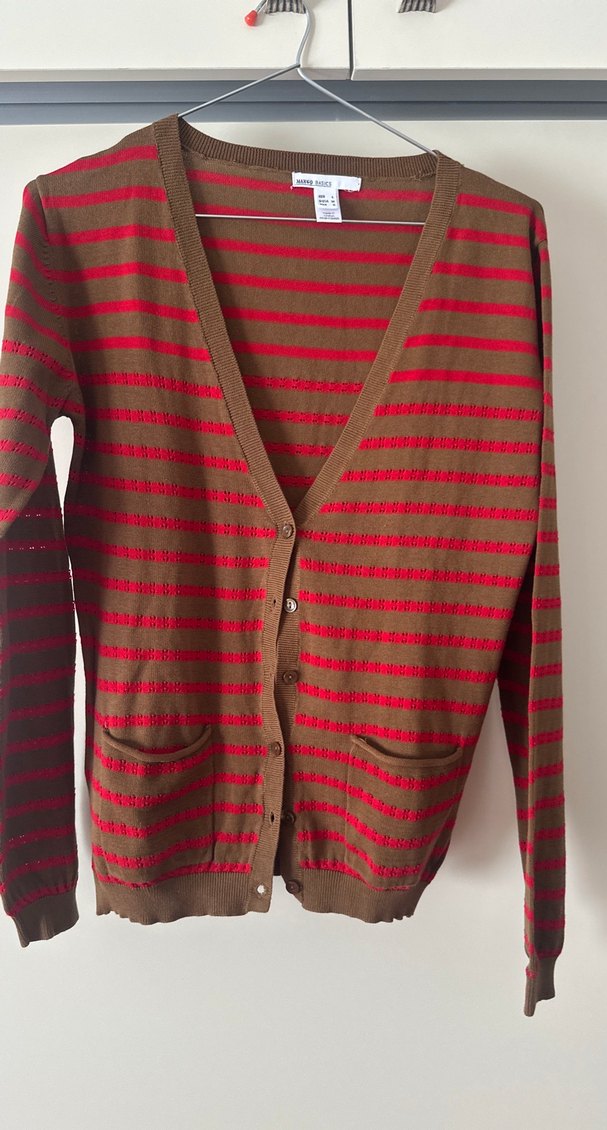 Kahverengi ve kırmızı çizgili, düğmeli, uzun kollu, notched lapel yakalı triko hırka. Rahat kesimli, günlük kullanıma uygun.