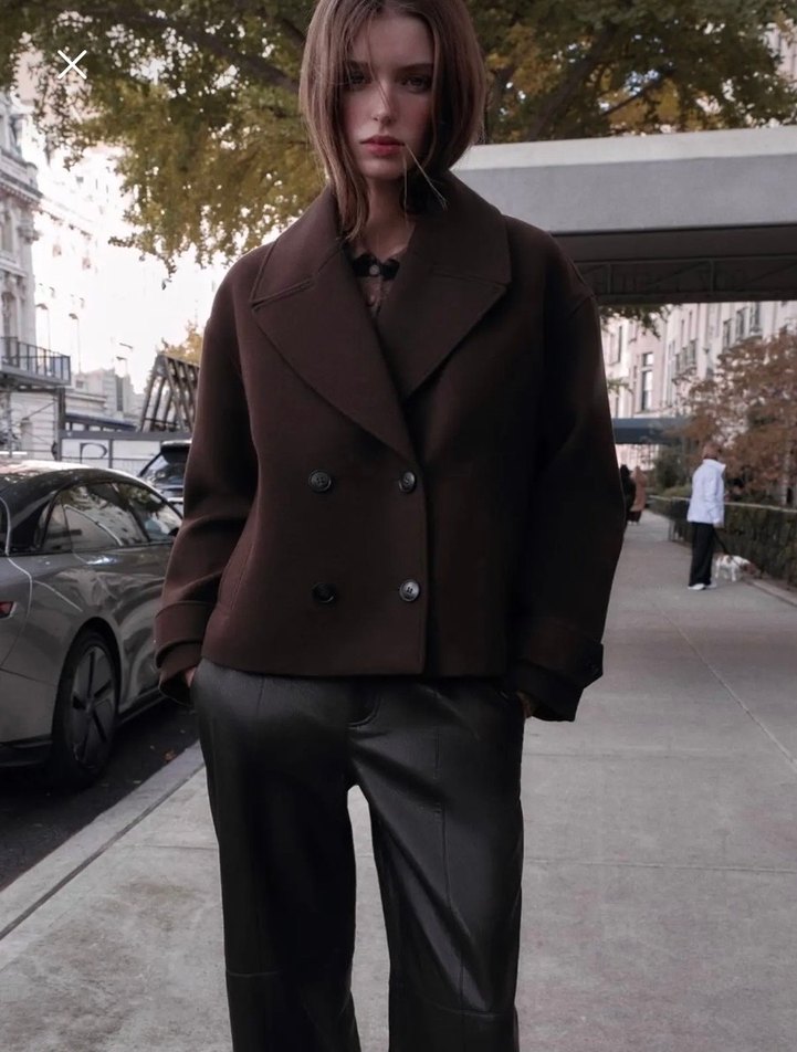 Düğmeli önü ve kesik yaka detayıyla, kahverengi deri midi ceket, günlük sokak stiline uygun rahat bir kesime sahiptir. Uzun kolludur ve desensizdir. Bordo kahve arası bir renkte astar rengi bordo iki kez anca giyildi