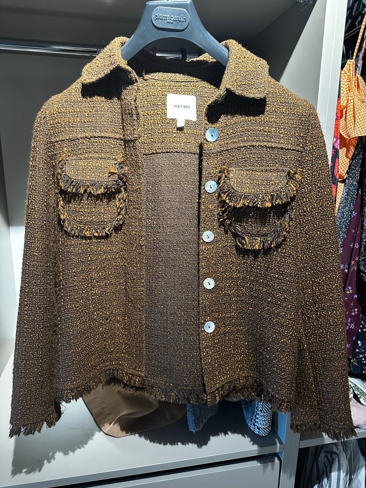 Kahverengi kısa yün ceket, düğmeli ön, kesik yakalı ve işlemeli detaylara sahiptir. Salaş kesim ve uzun kolludur, günlük sokak stili için uygundur.