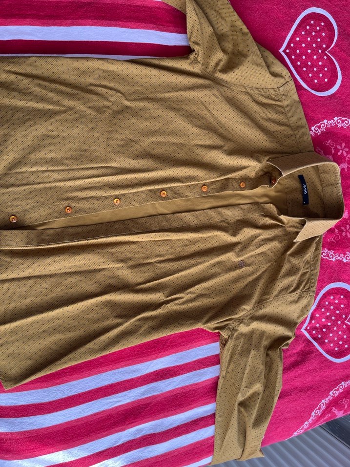 Düğmeli, kısa kollu, yakalı kahverengi erkek gömleği. Parlak sentetik kumaştan, normal kesim ve günlük sokak tarzına uygun.