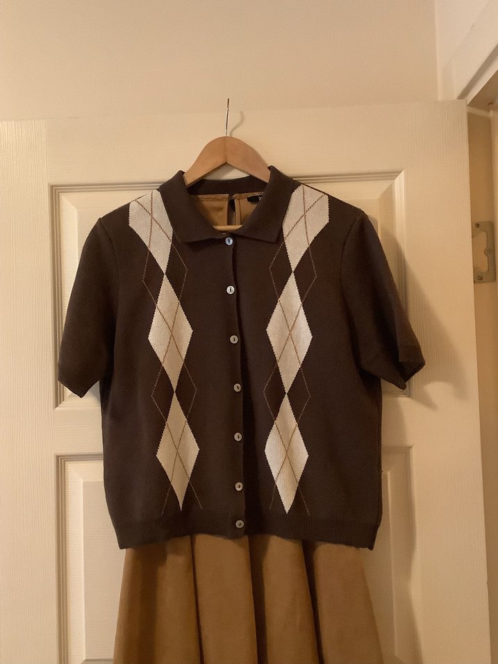 Sedef Düğmeli ve kısa kollu, düz kesimli koyu kahverengi örme kazak. Baklava desenleri ve yakalı tasarımıyla günlük kullanıma uygun. Defosuz, sadece bir-iki kez kullanıldı. Sezon ürünüdür.