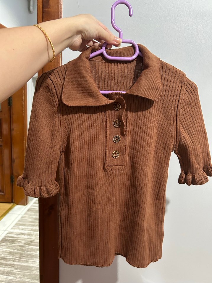 Düğmeli ön kısmı ve yakalı kahverengi triko kazak, kısa kollu ve volanlı kenarları ile normal midi uzunluktadır. Günlük sokak stiline uygundur.