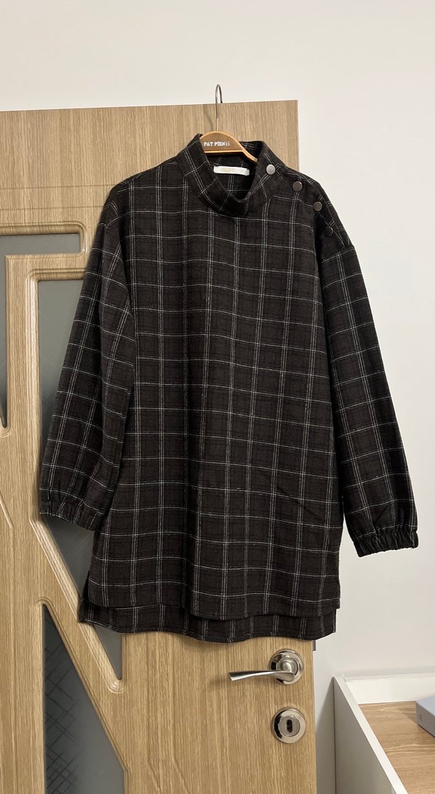 Oduncu gömlek kumaşı Allday Tunik .Kahverengi yün düğmeli, notlu yaka ve uzun kollu tasarıma sahiptir. Baskılı deseni ve midi boyuyla günlük kullanıma uygundur.