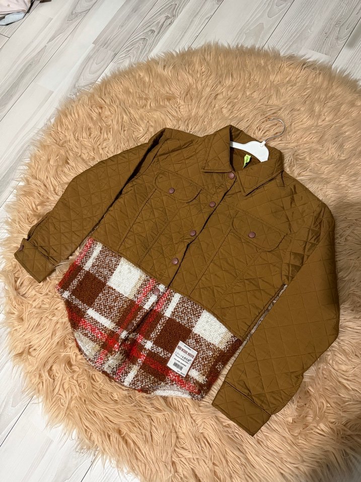 Düğmeli, uzun kollu, kahverengi kız çocuk Kısa boylu, bol kesim ve polar kumaşlı, alt kısmı ekoseli rahat bir sokak stili parçası.