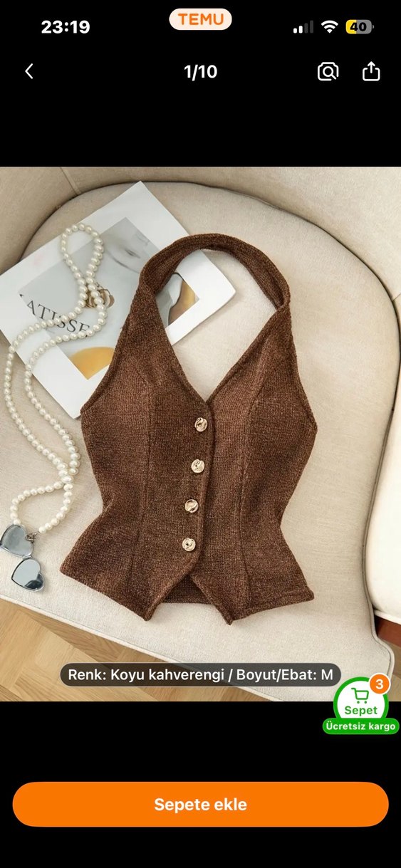Düğmeli, V yakalı, kolsuz ve kısa boy triko yelek. Sim detaylı. M beden. Hiç giyilmedi malesef bana büyük geldiği için