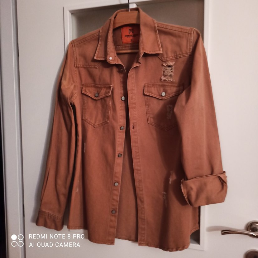 Düğmeli kahverengi kot kadın gömlek, notlu yakalı, uzun kollu ve bol kesimdir. desensiz yüzeye sahip, rahat sokak stili için uygundur. zara değildir.kremit tonu cok tatli rengi var.